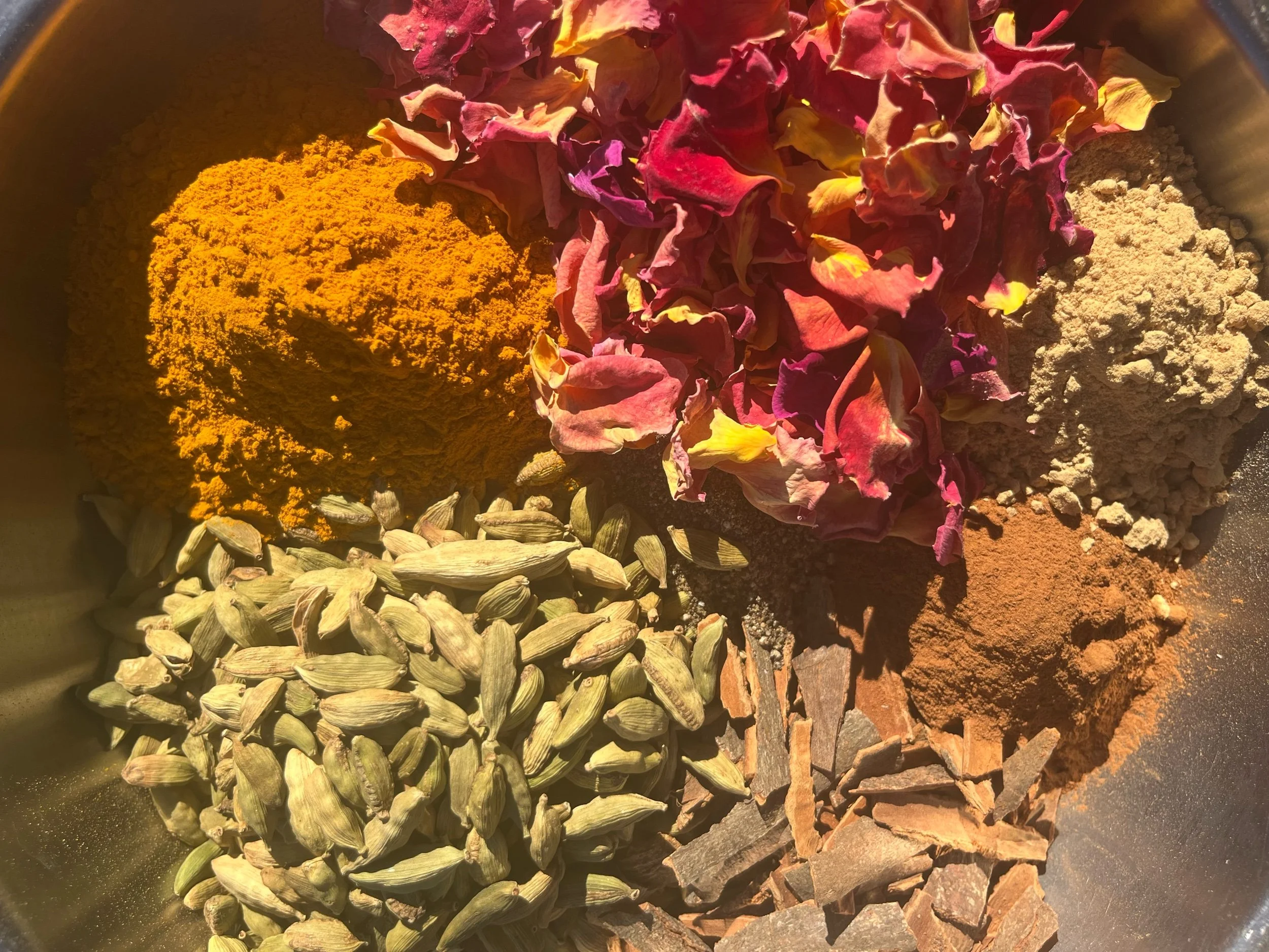 WARMTH SPICE TEA BLEND: turmeric powder, green cardamom, turmeric, ginger, cinnamon, ashwaganda root, black pepper, rose